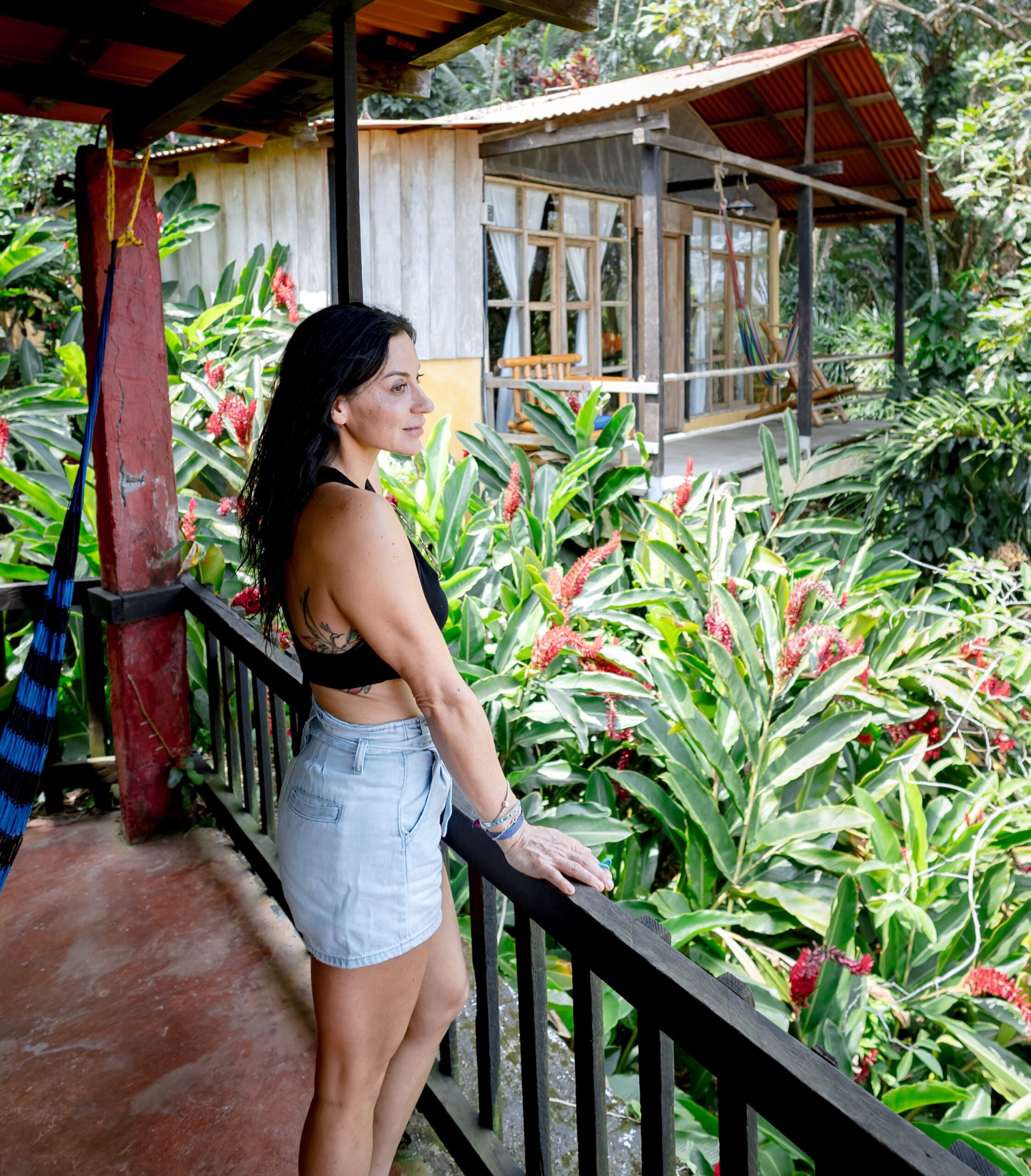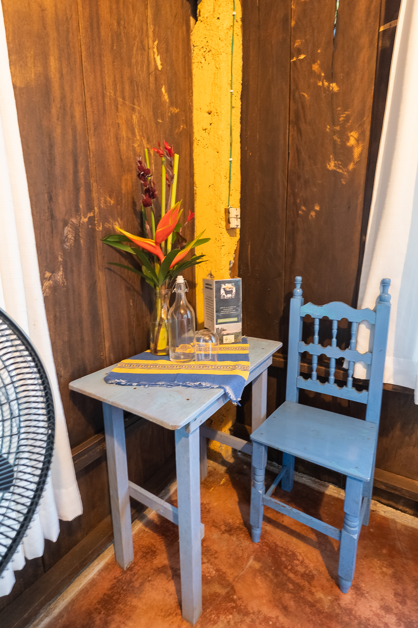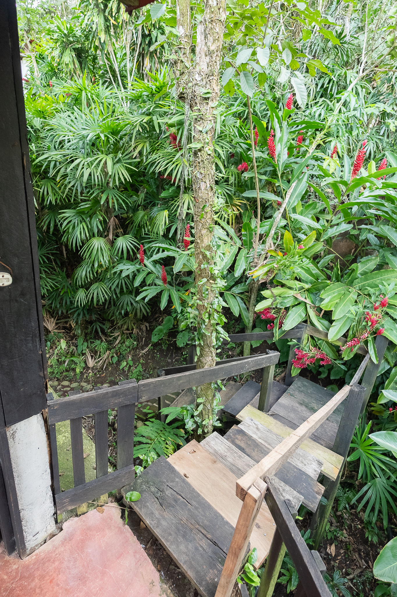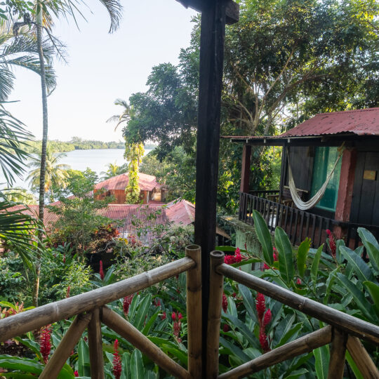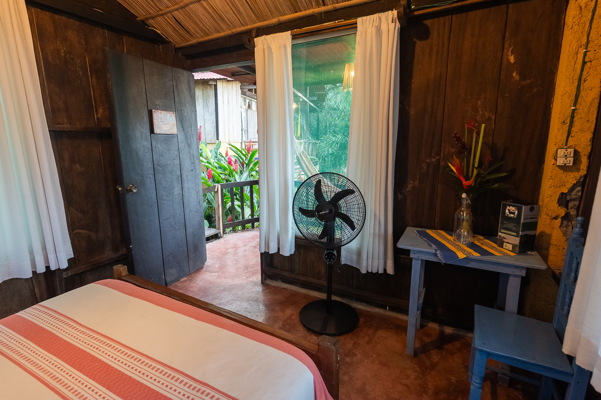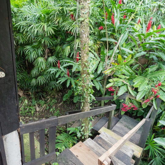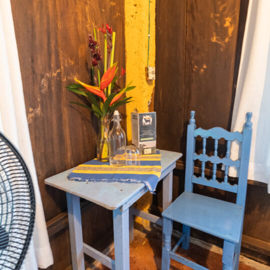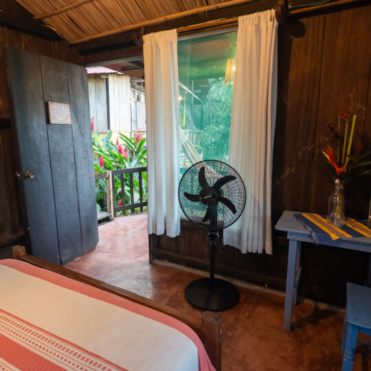 Cabaña para dos personas, cuenta con una cama matrimonial y está enclavada en medio de una loma reforestada con vista a los jardines y áreas verdes de la Reserva. El baño se localiza en el exterior.
