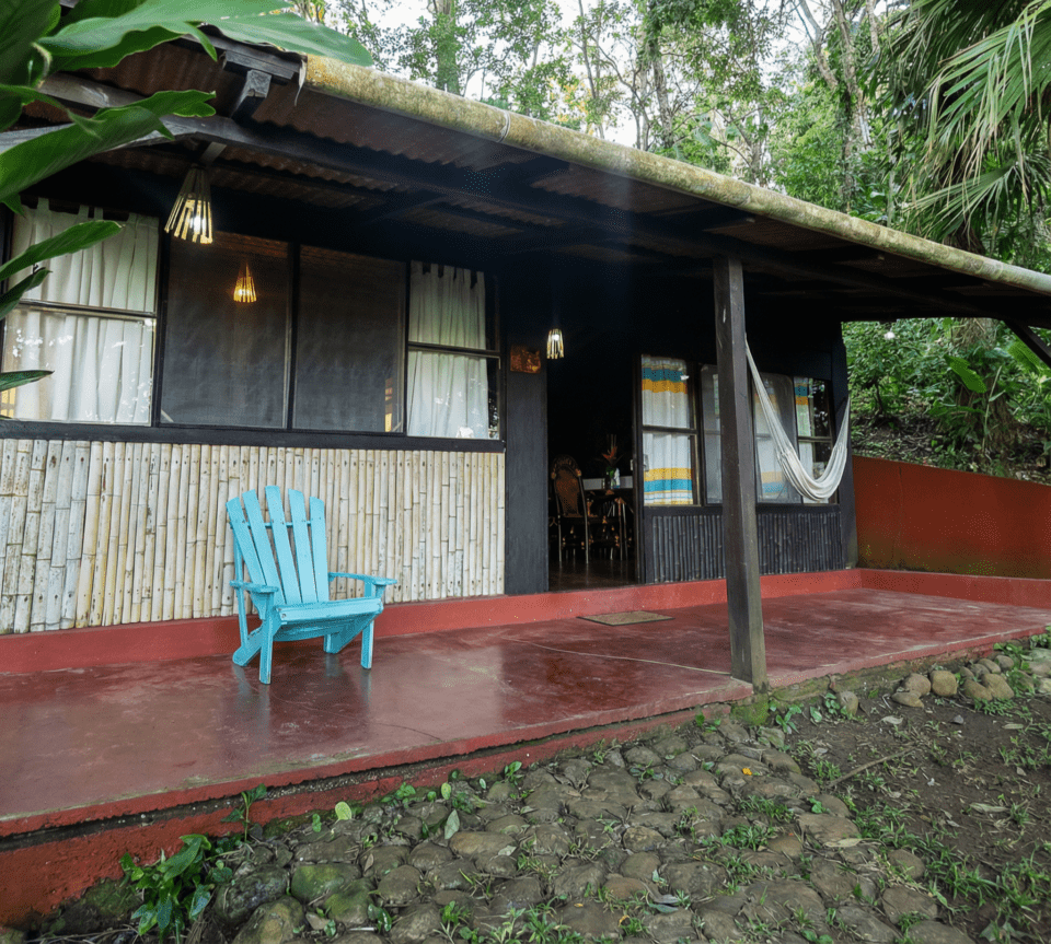 Cabaña para cuatro personas con estancia y porche con hamaca.